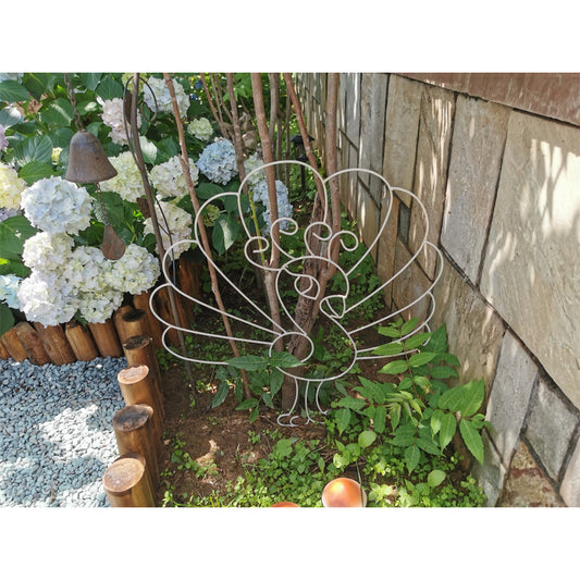 Deer and peacock shaped metal plant stands create an ideal trellis for climbing plants